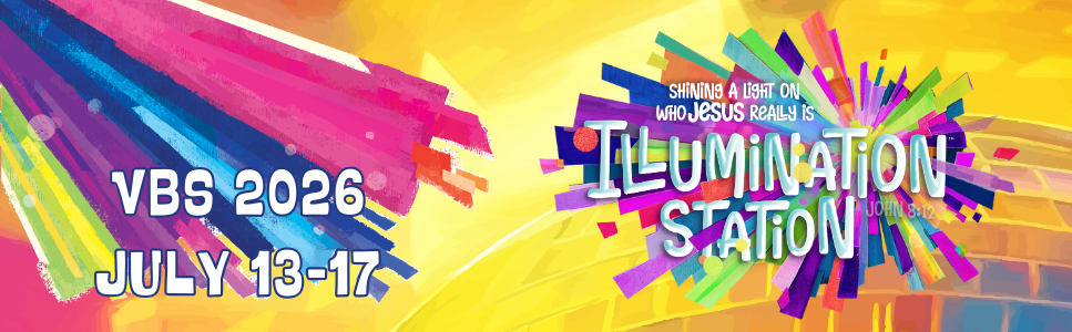 We're excited to announce that VBS 2026 is July 13-17, 9:00 a.m. - 12:00 p.m. On Friday, July 17, we will extend until 12:15 p.m. to recognize winners of the Missions contest immediately following VBS. The cost is free. Children entering Pre-K (age 4 by Sept 1) and children entering kindergarten through 6th grade in the fall may join us for the fun!